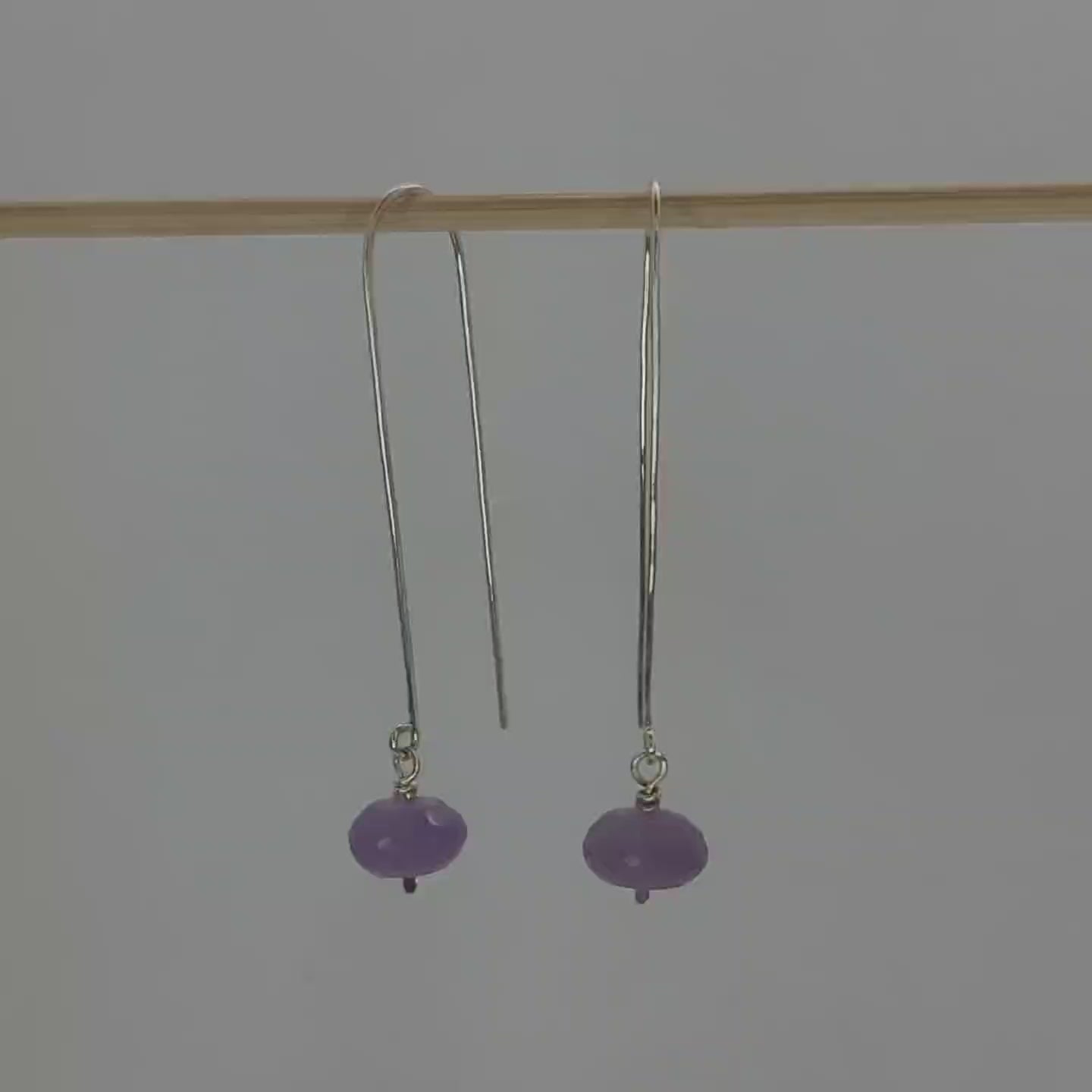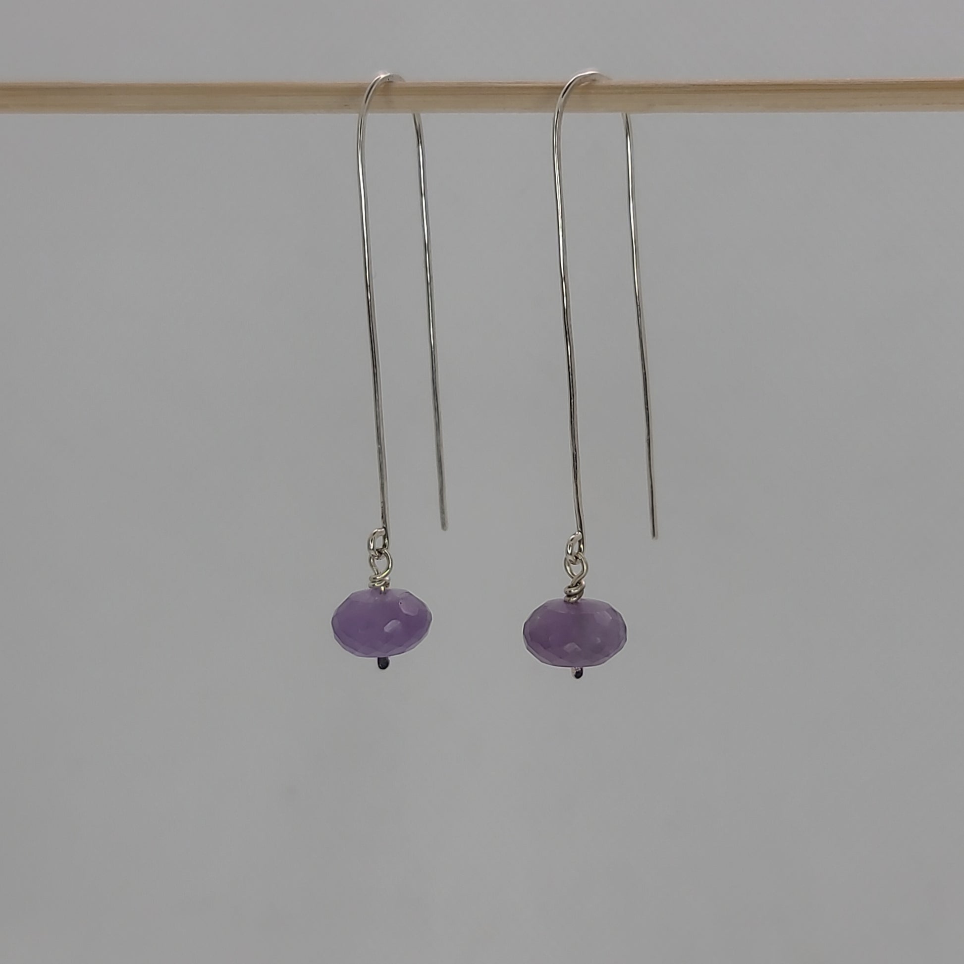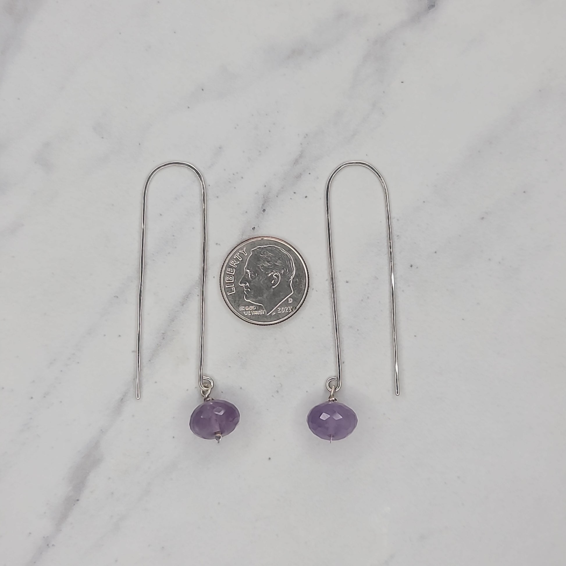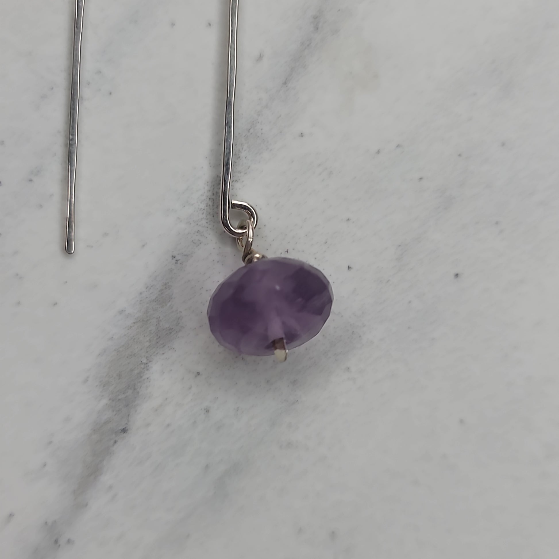 Amethyst rondelles dangle on hand formed head pins. Sterling silver ear wires are hand forged, hammered and polished to high shine. Length: just over 2", Width: 0.5".